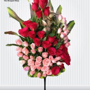 Basket Arrangement Bouquet with roses and kisantham