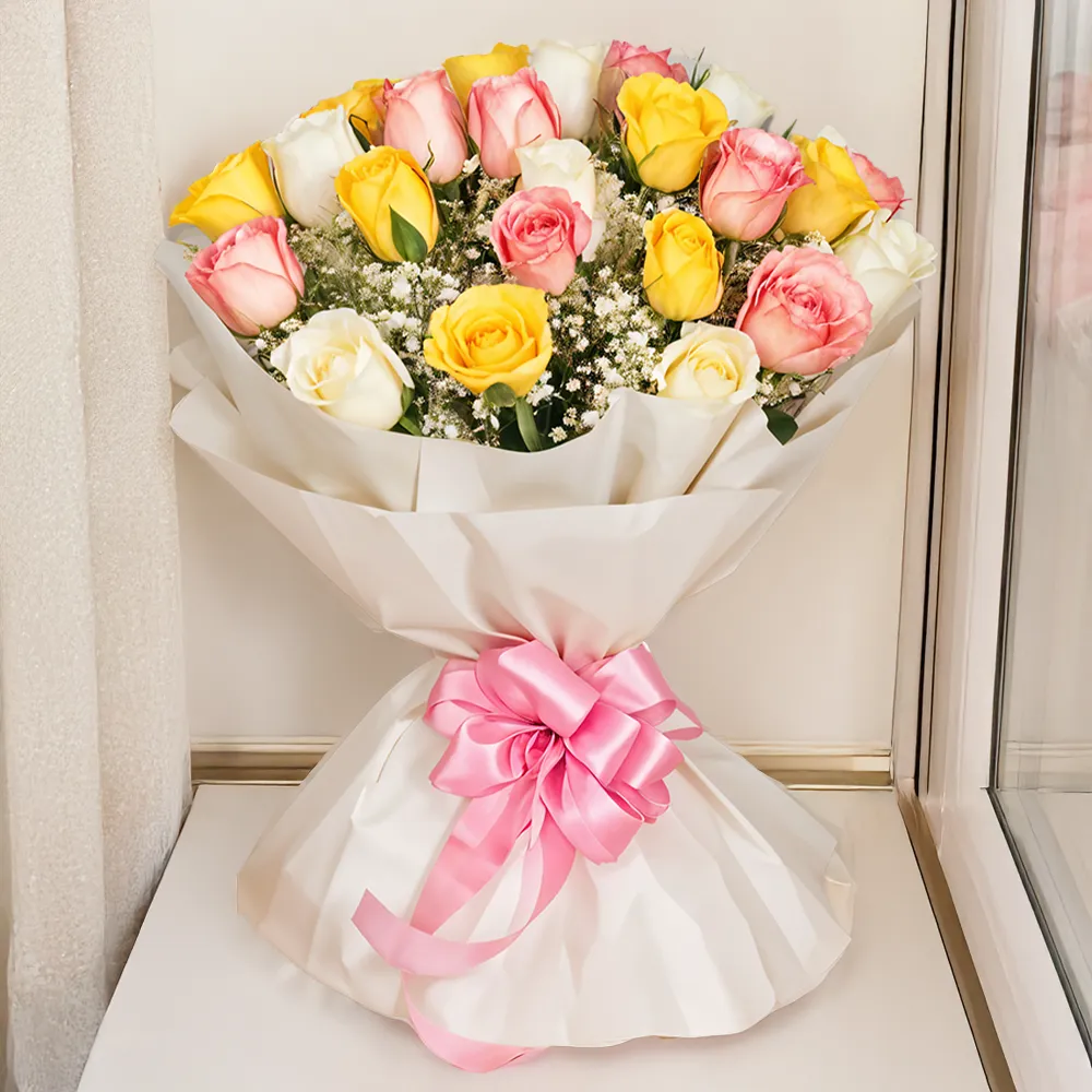 Bouquet of Pink, Yellow &White Roses with Baby Breath