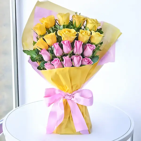 Bouquet of 10 stems of yellow roses and 10 stems of pink roses with greens in pink and yellow color sheet packing