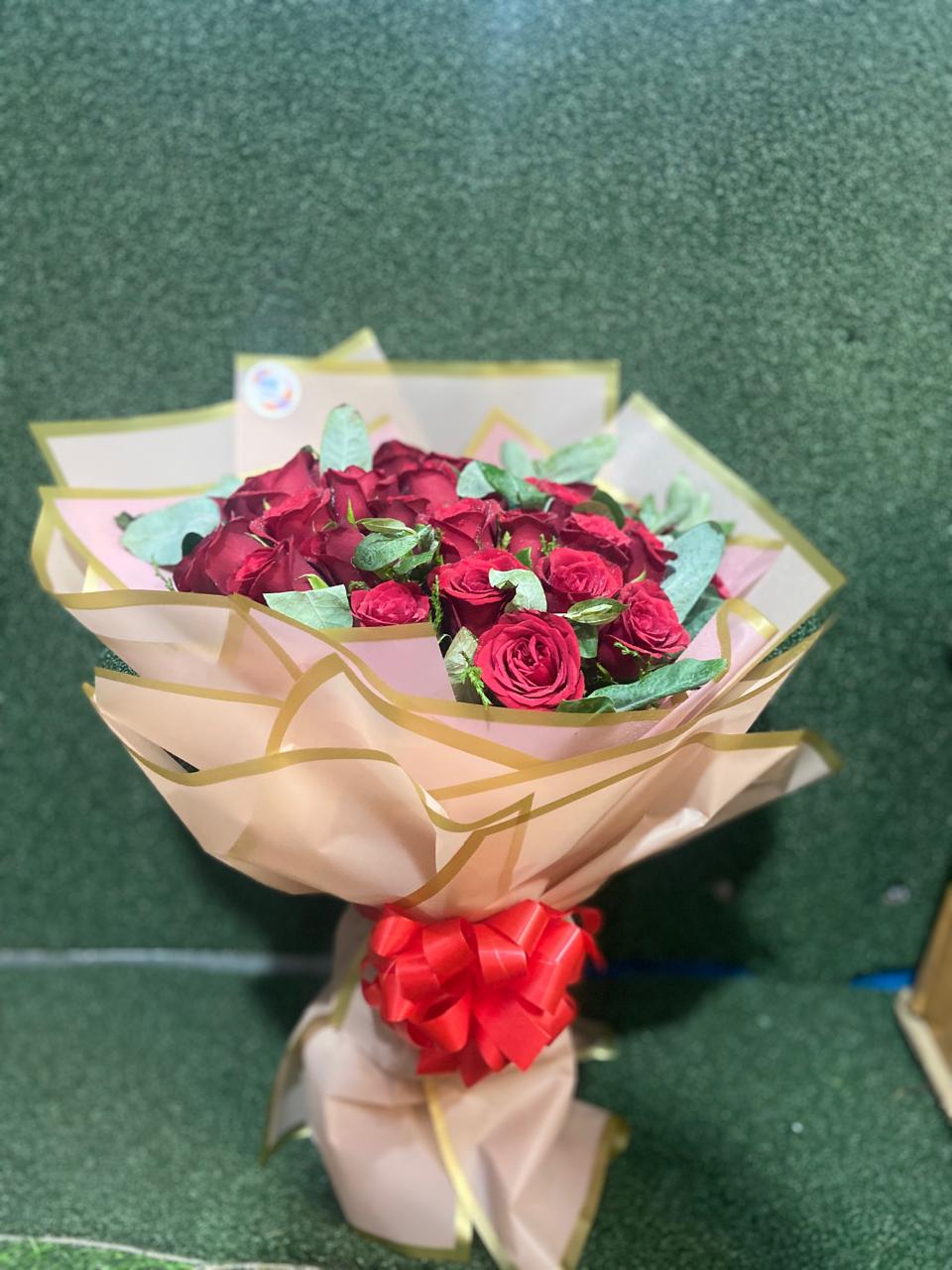 A luxurious hand-tied bouquet of 25 premium red roses 🌹✨, elegantly wrapped in soft cream Korean-style paper 🤍🎀.