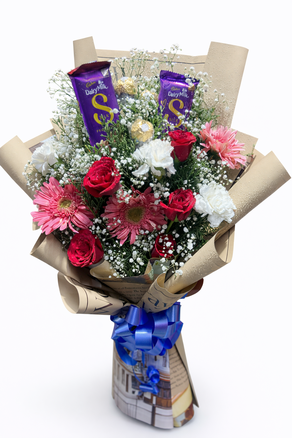 This beautifully wrapped bouquet features premium chocolates paired with lifelike silk flowers, styled in a trendy newspaper wrap for a modern, classy look.