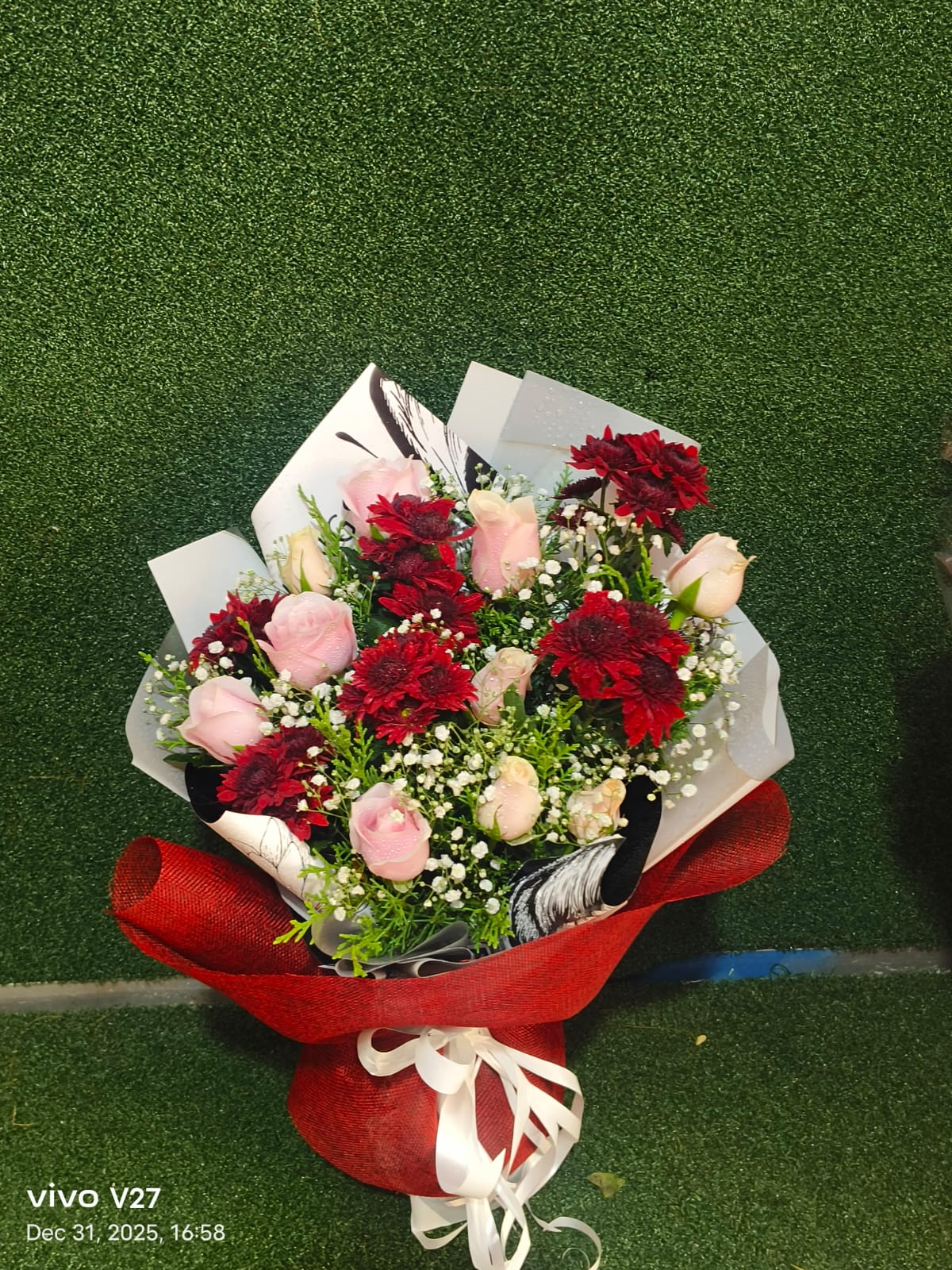 Flowers: Pink Roses 🌹, Red Chrysanthemums 🌺, Baby’s Breath 🤍