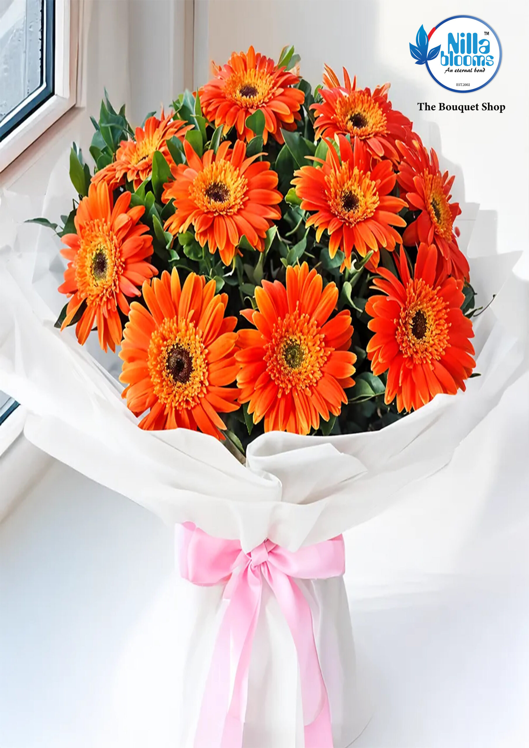 This stunning bouquet of fresh orange Gerbera daisies is beautifully wrapped in elegant white paper and finished with a soft pink ribbon π.