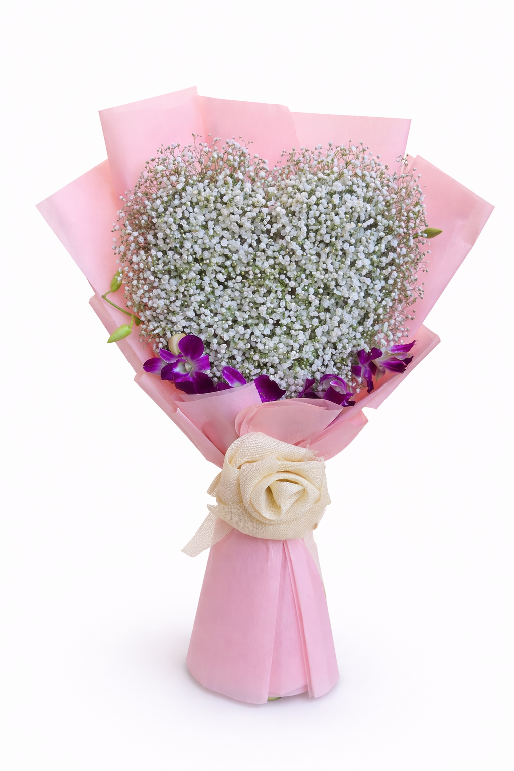 A stunning heart-shaped bouquet made with fresh white gypsophila (babyβs breath),