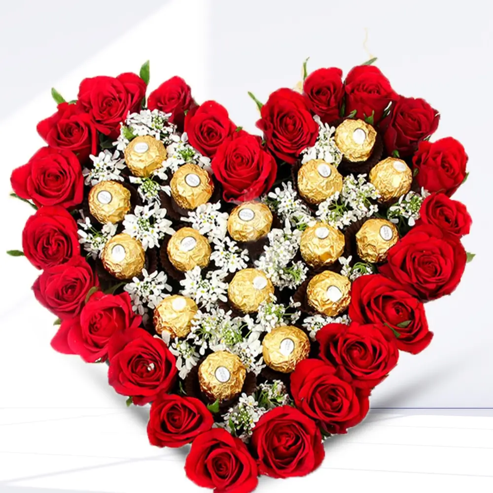Heart Melted 16 Ferrero Chocolates and Red Roses, Gypso Fillers heart shape chocolate bouquet for yours special person