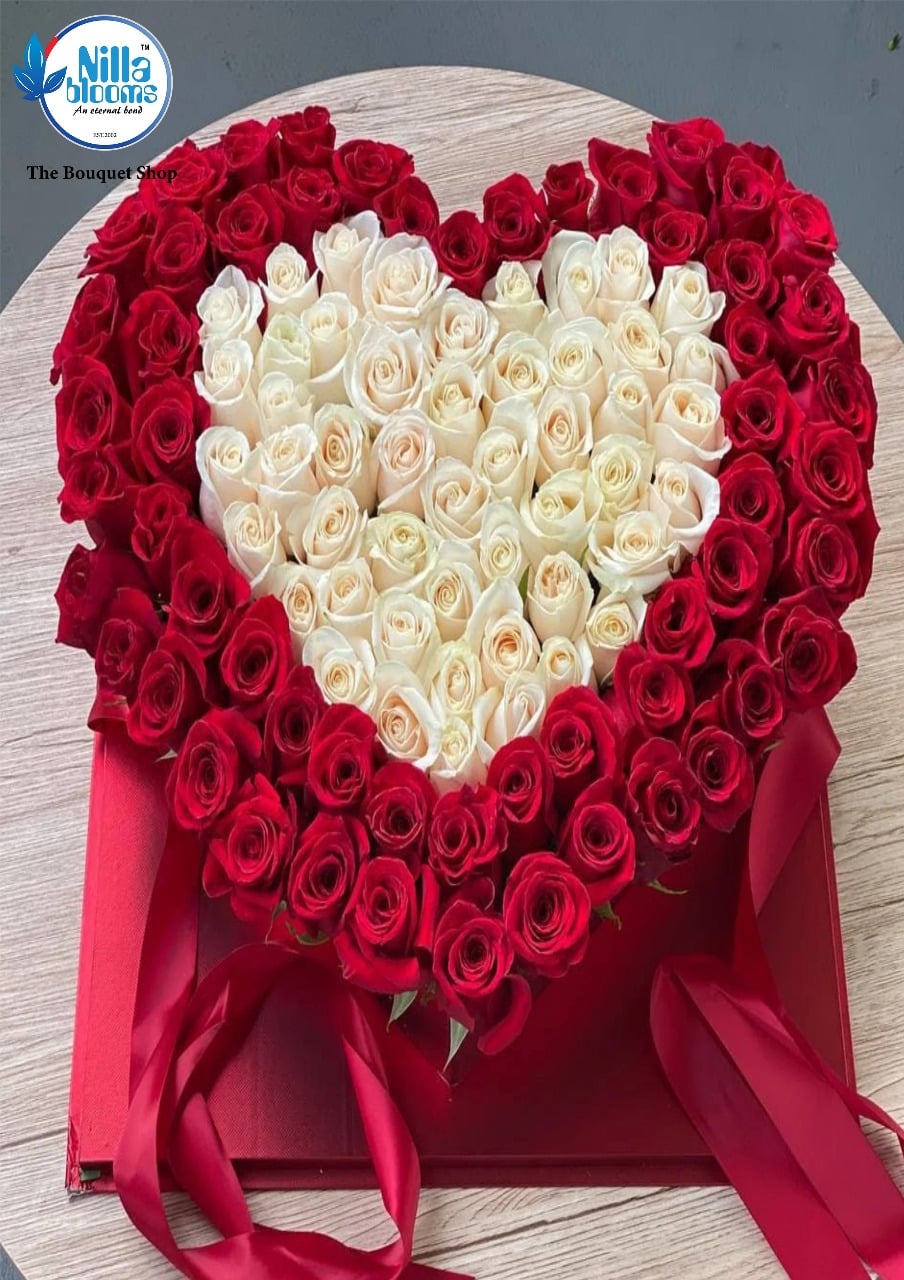 A stunning blend of passionate red roses embracing a pure white rose heart, beautifully presented in an elegant keepsake box.