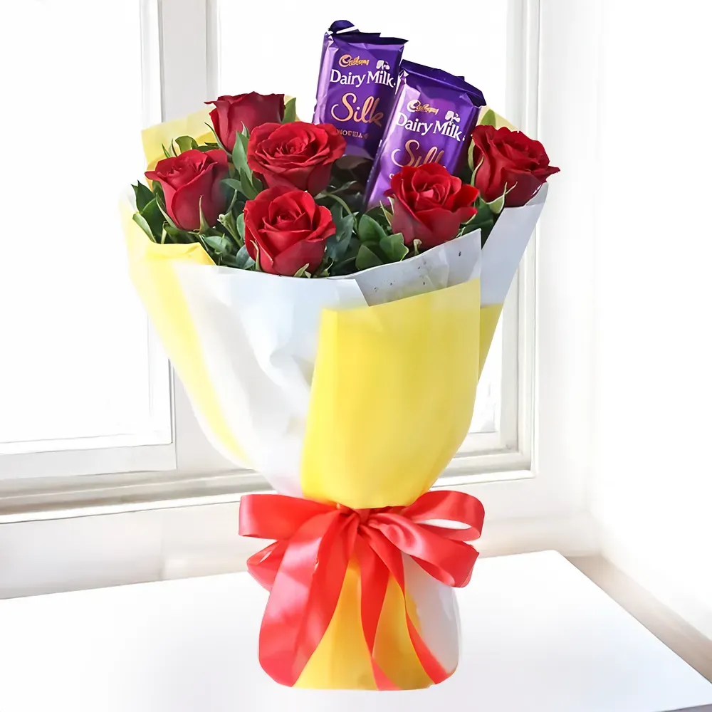 Bouquet of 6 Red Roses & 2 Dairy milk Silk Chocolates in yellow and white sheet packing