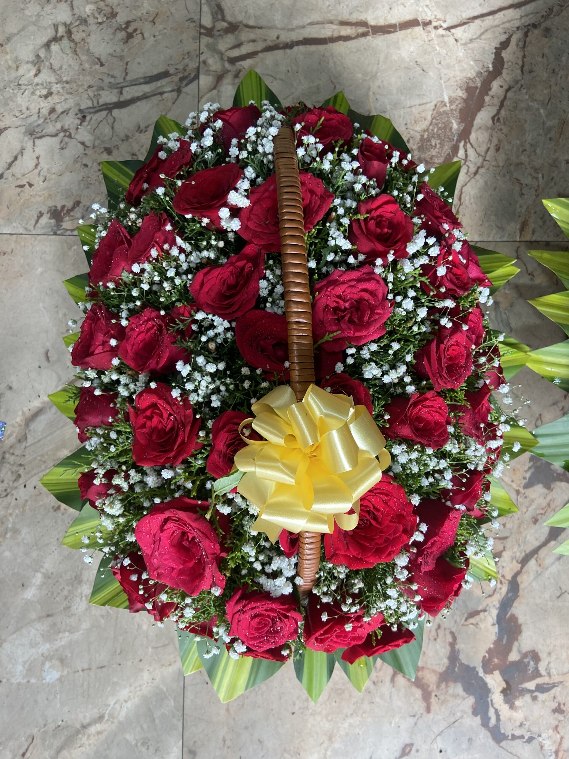 This stunning basket arrangement features vibrant red roses beautifully paired with delicate white fillers and lush green leaves. Finished with a charming golden ribbon on the handle, it creates an elegant and heartfelt display perfect for celebrating love, gratitude, or any special moment. A timeless expression of beauty and affection.