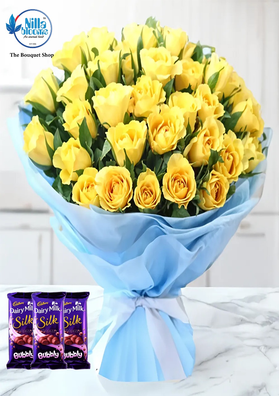 Bright, cheerful, and full of warmth—this delightful bouquet of yellow roses is designed to bring sunshine into any moment. Expertly arranged with lush green foliage and wrapped in a soft blue premium sheet, this bouquet radiates positivity and elegance.