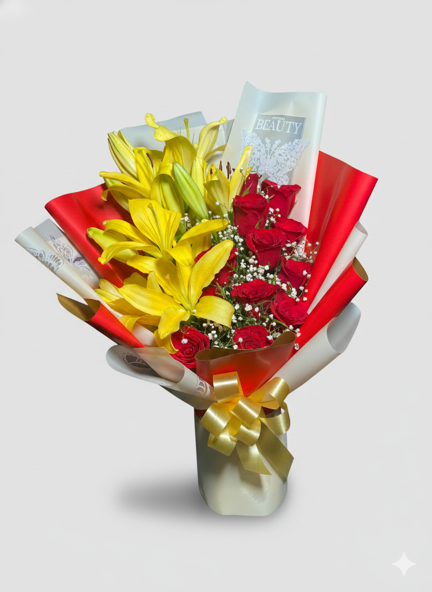 A stunning floral arrangement featuring 4 bright yellow lilies paired with 12 classic red roses, beautifully wrapped in red and cream butterfly-style Korean wrapping.